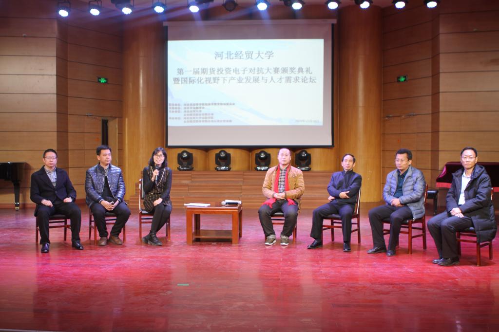 在圆桌论坛环节,香港交易所市场发展科内地客户发展部副总裁郭菲,鸡蛋期货交割库同集团公司敦朴贸易公司副总经理郝建然,玉米、白糖、小麦期货交割库冀粮集团副总裁赵长尧,世祖资产私募副总经理刘光普,永安期货股份有限公司石家庄营业部总经理王吉元,河北师范大学商学院教授于汝学、石家庄铁道大学经济管理学院副经理张艳辉、122cc太阳成集团副经理杨雪美,共八位产学界专家学者分别围绕“期货+保险/订单”和“期货+保险/期权”如何服务区域产业、金融国际化视野下企业如何运用期货服务自身发展战略、如何获取正常利润和交易利润等相关的做法以及金融国际化对人才的要求等议题进行分享交流,并与同学们进行互动,现场气氛活跃,同学们纷纷举手发言,与业内专家探讨期货交易过程及人才需求等相关问题。