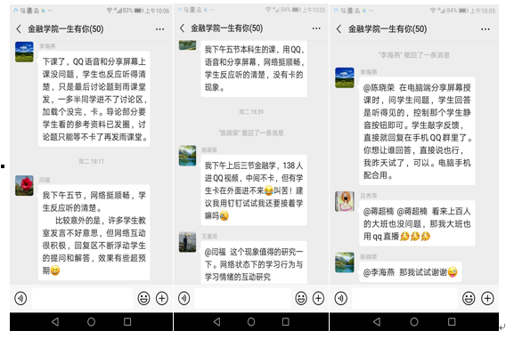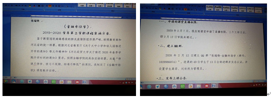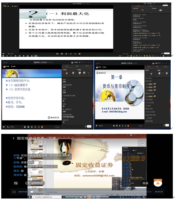 通过学习,老师们基本掌握了远程教学的技术和方法,切实提高了自身信息化水平和在线教学能力,自2月17日开始,公司教师陆续展开各类在线课程平台教学、直播教学以及混合式等多种教学方式。如闫福教授的《公司金融》通过开通QQ直播间授课,蒋超楠老师的《金融学》采用经贸学堂在线与QQ直播混合的教学模式,李建英教授的《投资项目评估与管理》课程采用中国大学MOOC平台与QQ视频相结合的模式,王风华老师的《银行实务》课程采用在线辅导+智盛智慧金融平台,还有赵璐老师的《固定收益证券》采用钉钉直播模式等等,每一位老师根据课程特点选择合适的平台,采用多样化的授课形式。
