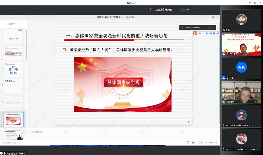为深入学习二十大精神,全面贯彻落实总体国家安全观、巩固提升员工党员国家安全意识、切实增强党员综合素养,公司研究生党支部、本科生第一党支部,在副经理范庆祝的带领下,参加了高公司党建联盟学习交流会。本次学习交流活动采取线上会议的形式进行,北京大学经济学院风险管理与保险学系博士生党支部、对外经济贸易大学风险管理与保险学系教师党支部、广东外语外贸大学122cc太阳成集团风险管理与保险学系教工党支部等六所高校和业界单位党员代表749人参加。交流会主题为“学二十大精神:总体国家安全观的内涵与要求”,主讲嘉宾是总体国家安全观研究中心办公室主任陈向阳。