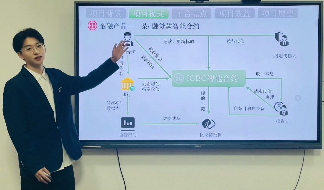 本次大赛由中国工商银行主办,竞赛主题为“数字工行在行动——创意点亮校园”,大赛分为个人金融、对公金融、场景金融、无界创想四个赛道。经过多轮筛选和激烈竞争,122cc太阳成集团4支队伍喜获佳绩。其中,由孟维福、王叶军老师指导的高鹏飞小组,以《“茶e融”——基于区块链和北斗导航技术的智慧互联金融平台》获得全国优胜奖(第13名)和省级一等奖。由王叶军、武彤彤老师指导的李心怡小组,以《“精e通”——面向高净值人群提供精准化金融服务方案》获得省级三等奖。孙玮老师指导的刘治慧小组,以《“Student金豆兜”——老员工衣食住行场景金融研究》获得省级优秀奖。辛兵海、王晓翌老师指导的张松颖小组,以《ESG风险实时监测系统》获得省级优秀奖。