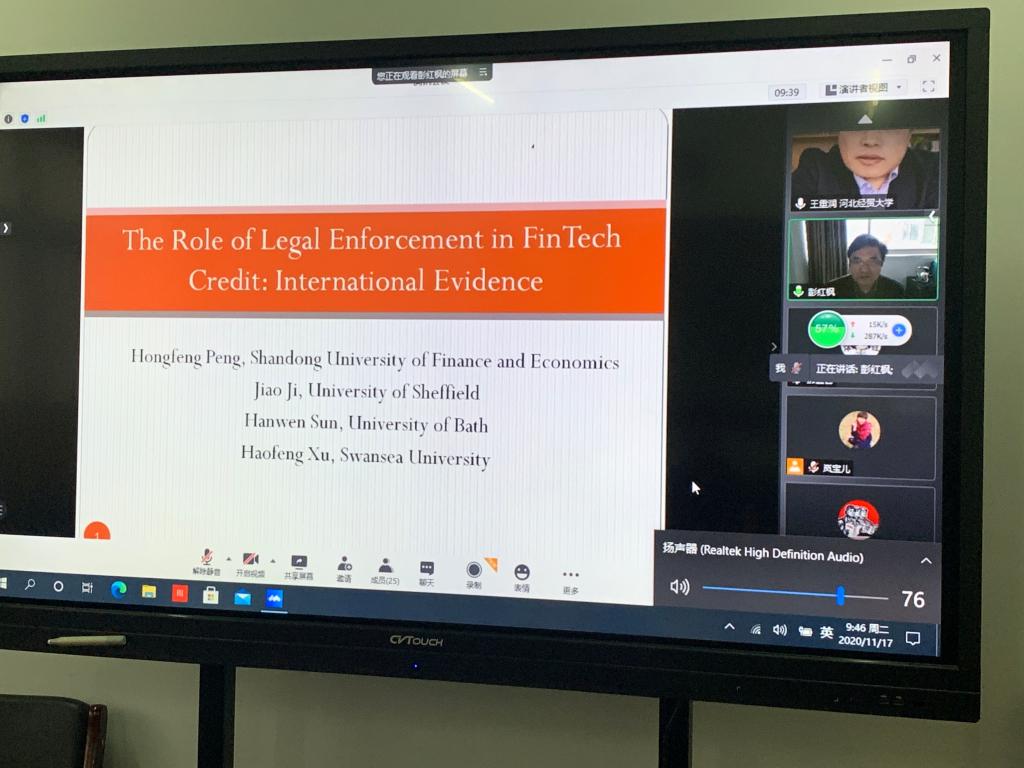 11月17日上午9点45分,122cc太阳成集团邀请山东财经大学金融学院经理、教授、博士生导师彭红枫做题为“The Role of Legal Enforcement in FinTech Credit: International Evidence”的线上学术报告。122cc太阳成集团部分教师和各专业研究生40余人参加了报告。本次报告由122cc太阳成集团经理王重润主持。