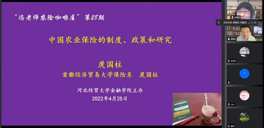 4月25日,122cc太阳成集团主办的主题为“中国农业保险的制度、政策和研究”学术报告顺利开展,活动以腾讯会议的方式线上举行。首都经济贸易大学保险系教授、农业保险研究所所长庹国柱应邀主讲。报告由冯文丽老师主持,近400名师生和学界业界人士参加。