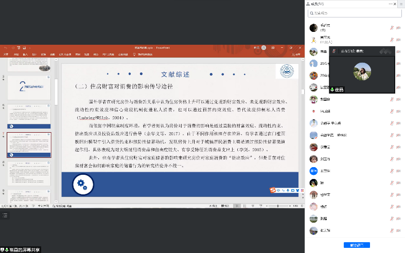 崔晶同学以《住房财富对城镇家庭消费的影响机制分析》为题,选取合适的变量构建多元回归模型探讨了住房财富的财富效应、流动性约束以及自我保险效应等内容;杨妍同学以《住房流动性对家庭资产配置影响研究》为题,结合住房调控政策,构建核心解释变量衡量住房流动性,从限购政策、家庭风险偏好水平、家庭预期收益三个维度剖析了住房流动性对家庭资产配置的影响及其机制。来自学校的柴国俊、李妍、赵璐曼、高旺、孟维福等老师,对两位同学的研究作了精彩点评和悉心指导。老师们对崔晶同学的研究提出了进一步厘清消费理论、添加控制变量解决内生性问题,以及实证结果与现实相悖需要给出合理解释等建设性意见;对杨妍同学的研究,提出了添加核心解释变量计算的支撑文献、采用DID方法研究住房调控的政策效果,以及运用非线性模型更为恰当解释住房流动性对家庭住房资产配置的影响等意见建议。