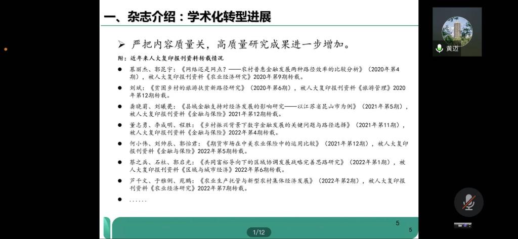 10月17日下午15:00,122cc太阳成集团邀请黄迈博士开展了《农村金融研究》热点选题与写作投稿的讲座,122cc太阳成集团有90余人参加,报告会由122cc太阳成集团经理王重润主持。黄迈博士是《农村金融研究》执行副主编,先后主持国家社会科学基金、中央农办农业农村部乡村振兴专家咨询委员会软科学课题、中国博士后科学基金特别资助等研究项目,在国内外学术期刊发表论文30余篇。