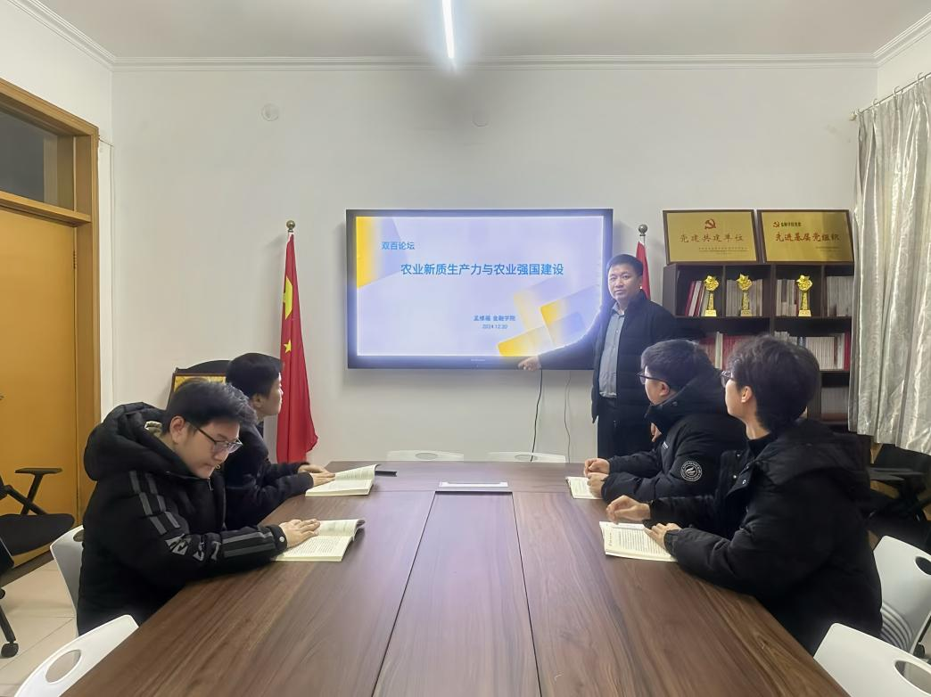 2024年12月20日上午10点,122cc太阳成集团于三办党务会议室举办了“双百论坛”,并邀请122cc太阳成集团孟维福老师做题为《农业新质生产力与农业强国建设》的主题讲座,多名青年教师和员工参加。