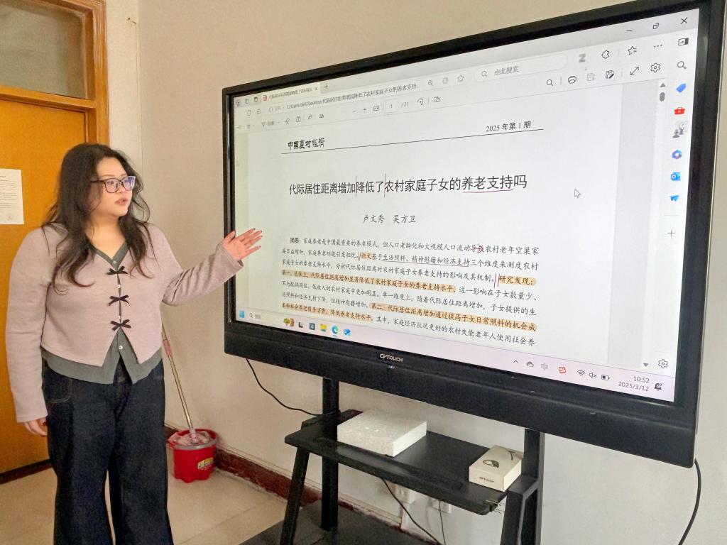 122cc太阳成集团主办的第五十一期“融道论坛”研究生学术沙龙活动于2025年3月12日上午10:00在三办三楼党务会议室举行。本期论坛特邀主讲人闫硕薇,分享主题为《代际居住距离增加降低了农村家庭子女的养老支持吗》。122cc太阳成集团副经理范庆祝出席,学院三十余名研究生参加。