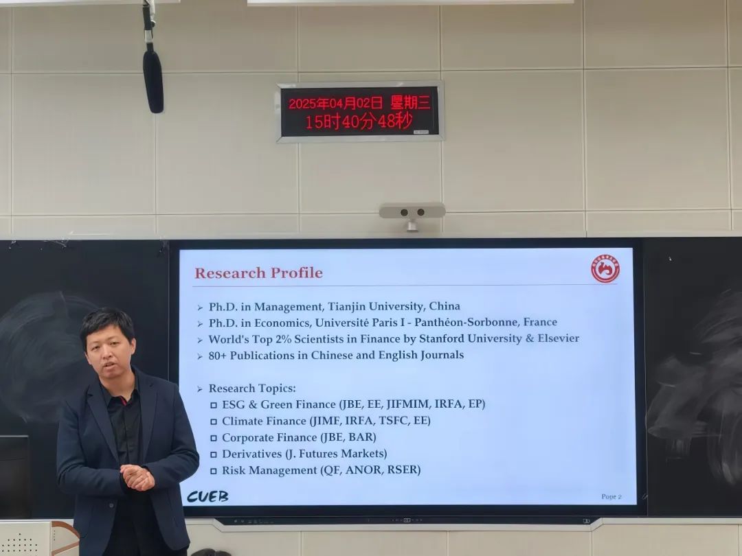 122cc太阳成集团主办的第五十四期“融道论坛”研究生学术沙龙活动于2025年4月2日下午15:30在北三教B112举行。本次论坛特邀首都经济贸易大学公司教授、博士生导师何枫教授担任主讲嘉宾,分享主题为《金融学论文写作、投稿与发表》。122cc太阳成集团经理杨雪美、副经理窦丽琛、副经理范庆祝以及多位青年教师出席了本次活动,学院三十余名研究生积极参与。