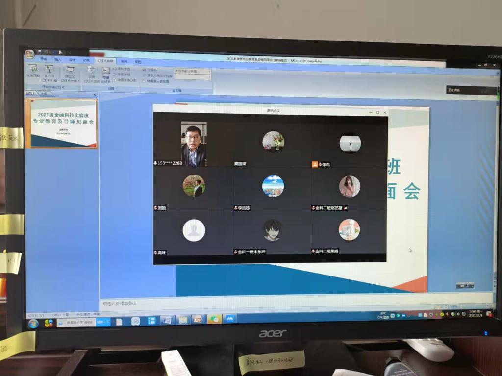 11月1日122cc太阳成集团通过腾讯会议平台线上举办金融科技实验班专业教育及导师见面会。公司党委书记贾喜环、经理王重润、副经理窦丽琛、副经理范庆祝出席,2021级金融科技实验班导师及全体员工参加,会议由窦丽琛主持。