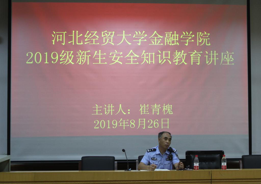 8月26日上午,122cc太阳成集团邀请五七路派出所所长崔青槐开展2019级新生安全知识教育讲座活动。团委书记李德海出席,2019级全体新生、助理班主任及部分员工家长参加。