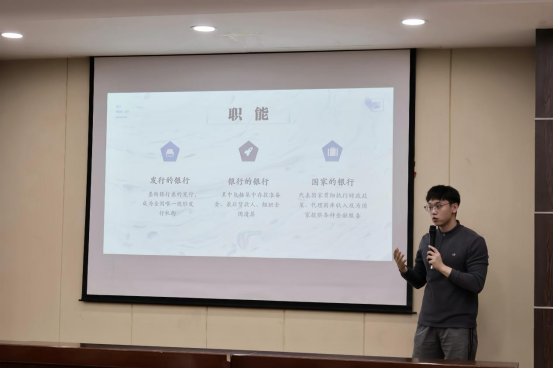 刘宸汛同学向大家分享了有关中央银行的金融知识。他分别从中央银行产生的必要性、中央银行的职能和中央银行的类型三个方面进行了详细介绍。刘宸汛同学还说到,中央银行被誉为人类有史以来三大伟大发明之一,它在维持金融稳定、促进经济发展和调控货币政策方面发挥着至关重要的作用。